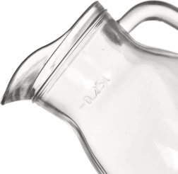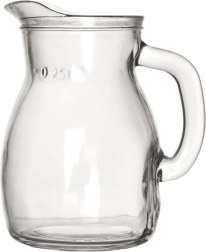 Pichet en verre pratique d’une capacité totale de 300 ml avec marquage 0,25 l pour un dosage précis. En verre transparent résistant, avec anse confortable et bec verseur profilé pour un service propre. Convient pour lait, crème, vin, eau, jus et sauces, compatible lave-vaisselle et micro‑ondes. Température maximale de boisson 60 °C.