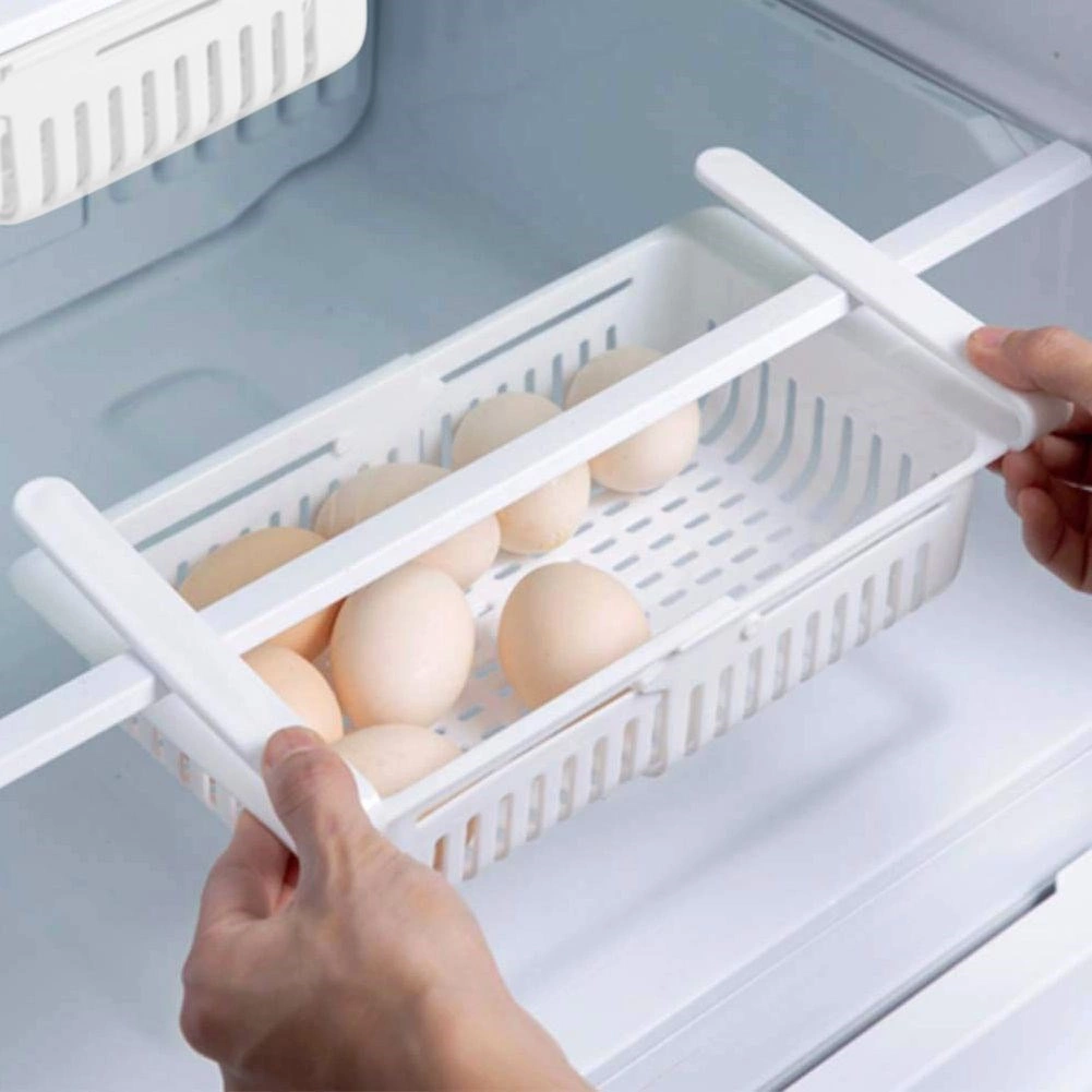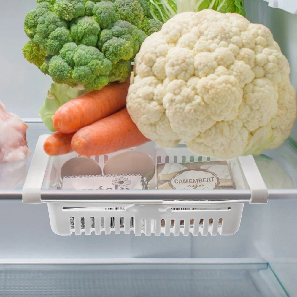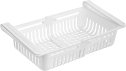 Panier sous-étagère pratique pour réfrigérateur, extensible de 21 à 28,7 cm, qui vous aide à exploiter intelligemment l’espace sous l’étagère. Léger, durable et facile à installer sans outils. Grâce à sa conception aérée, les aliments restent frais plus longtemps et tout est bien visible et à portée de main. Longueur extensible, installation facile sous l’étagère, fabrication robuste et ouvertures de ventilation pour une meilleure circulation de l’air.