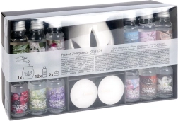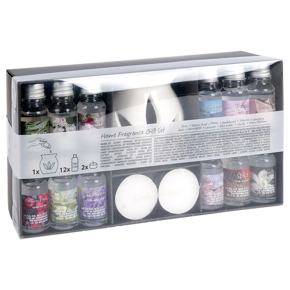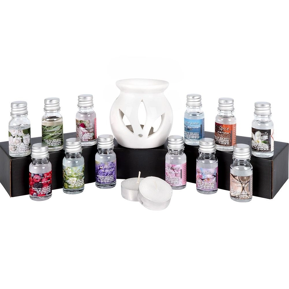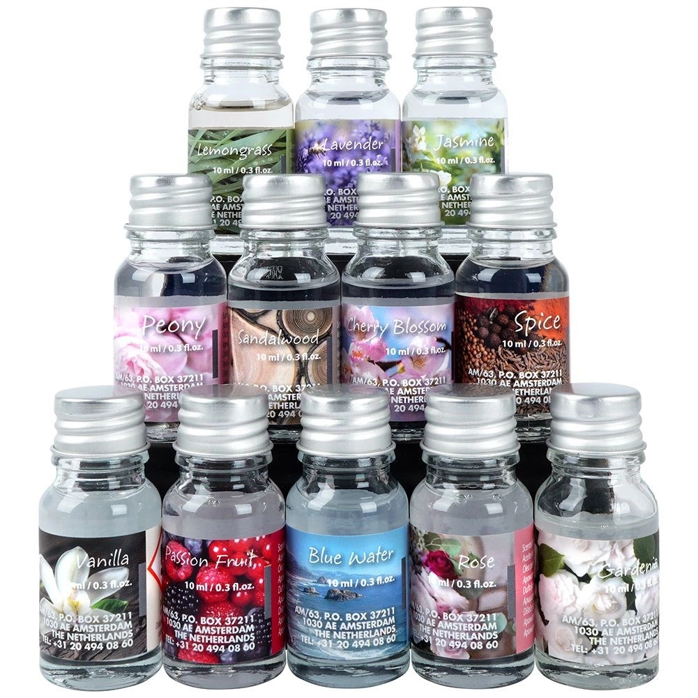 - 12× huile parfumée 10 ml : Spice, Passion Fruit, Peony, Sandalwood, Jasmine, Gardenia, Rose, Lemongrass, Lavender, Blue Water, Vanilla, Cherry Blossom