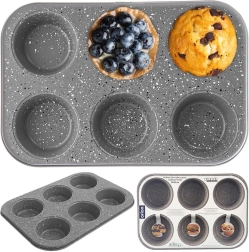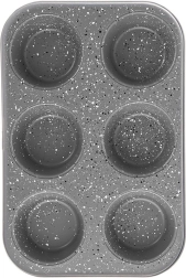 Découvrez le moule à muffins GRANDE, fiable, qui permet de cuire en une fois 6 pièces de très grands muffins. Grâce à la couche granit antiadhésive, la pâte n’attache pas et les pièces se démoulent facilement sans se déchirer. Le corps en acier au carbone robuste répartit la chaleur uniformément pour une cuisson optimale.