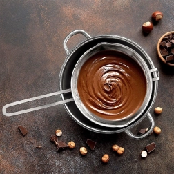 Deux becs verseurs latéraux facilitent un transvasement propre des ingrédients fondus. L’acier inoxydable résistant est facile à entretenir, compatible avec le lave-vaisselle et sans danger pour la santé. Sa forme étudiée permet d’essuyer facilement les restes de chocolat.