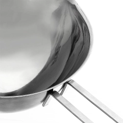 La longue poignée tient bien en main et le crochet latéral assure la stabilité du bol sur le bord de la casserole.