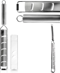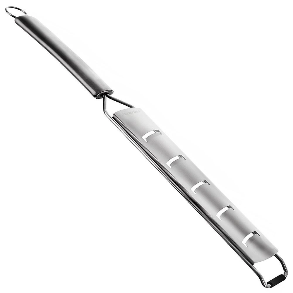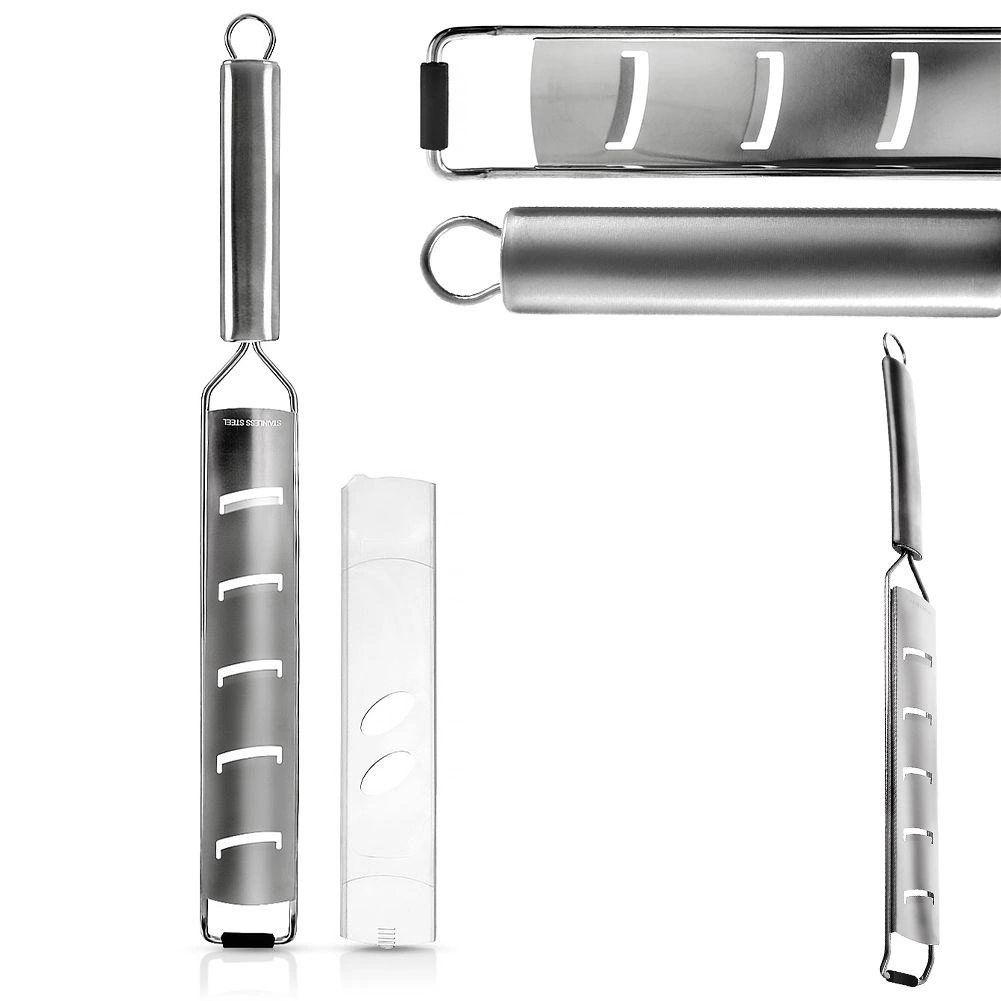 Râpe plate pratique en acier inoxydable de qualité avec cinq lames tranchantes pour des tranches régulières. Grâce à sa longue poignée, elle tient parfaitement en main, dispose d’une extrémité en caoutchouc pour plus de stabilité, d’un étui de protection pour un rangement sécurisé et peut être lavée au lave-vaisselle. Idéale pour fromages durs, légumes, fruits, ail et gingembre.