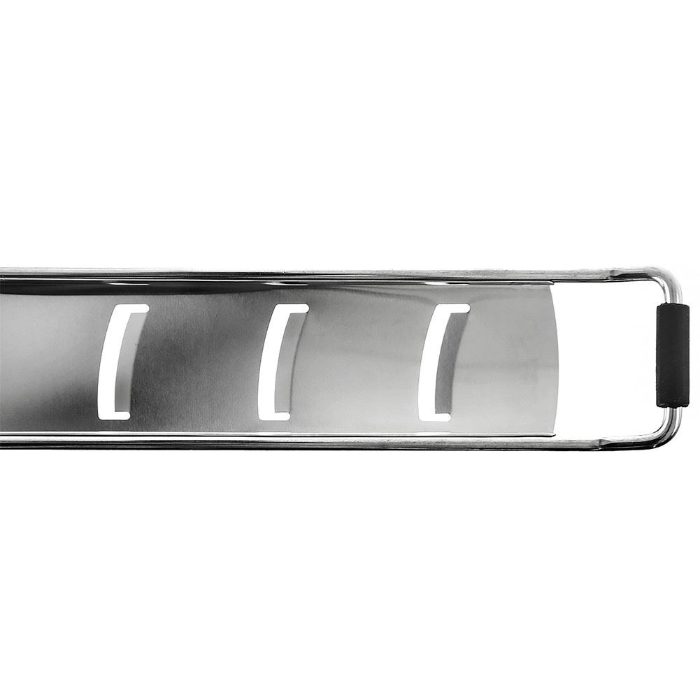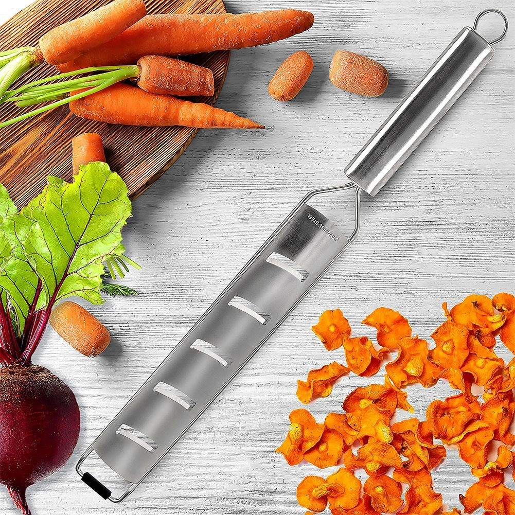 Râpe universelle en inox au profil plat pour un tranchage précis et rapide directement dans un bol, une poêle ou une casserole. Cinq lames tranchantes assurent une coupe nette sans écraser les aliments, tandis que l’embout en caoutchouc protège les surfaces de vos récipients des rayures et améliore la stabilité pendant l’utilisation.
