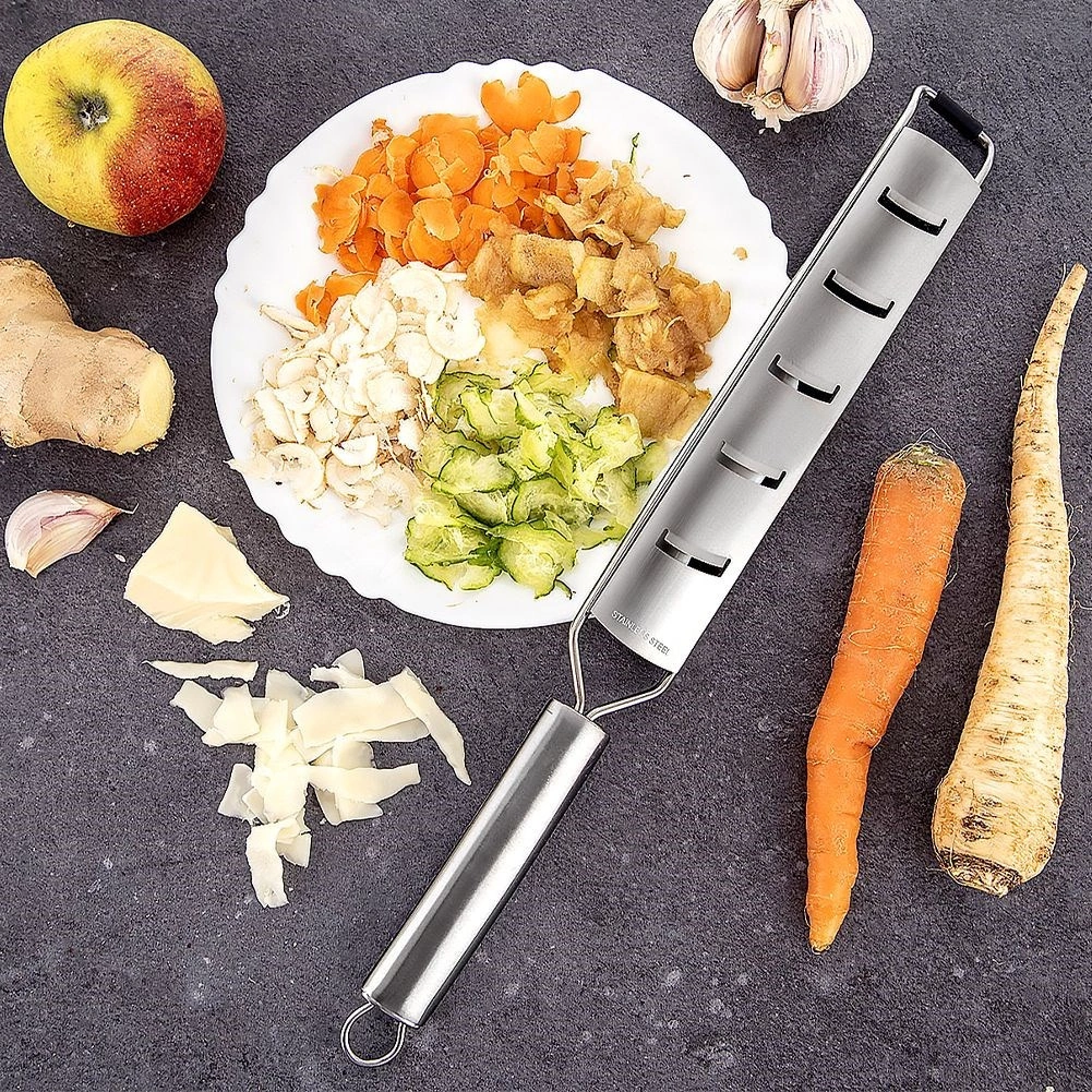 Un ensemble de fentes de coupe précises produit des tranches homogènes sans déchirer les aliments – idéal pour le fromage, la carotte, la courgette et les fruits.