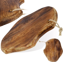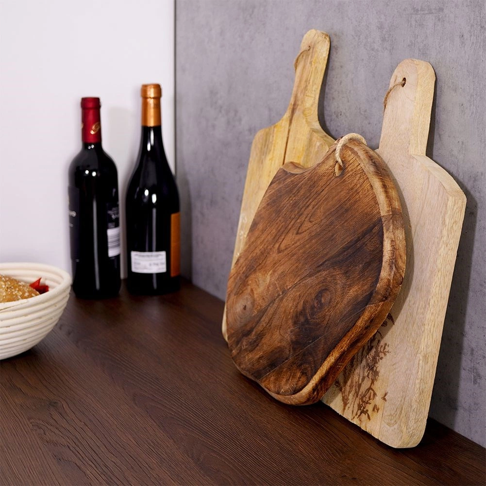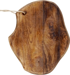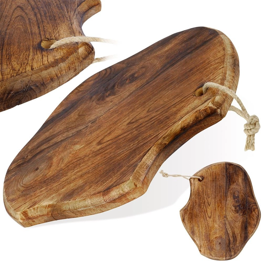 Planche en bois de manguier stylée pour une coupe quotidienne et un service élégant. Elle présente une forme naturellement irrégulière, une épaisseur robuste de 2 cm, un œillet avec cordon pour la suspendre et une résistance à l’humidité et aux déformations. Idéale pour servir fromages et charcuteries et comme élément décoratif de la cuisine.