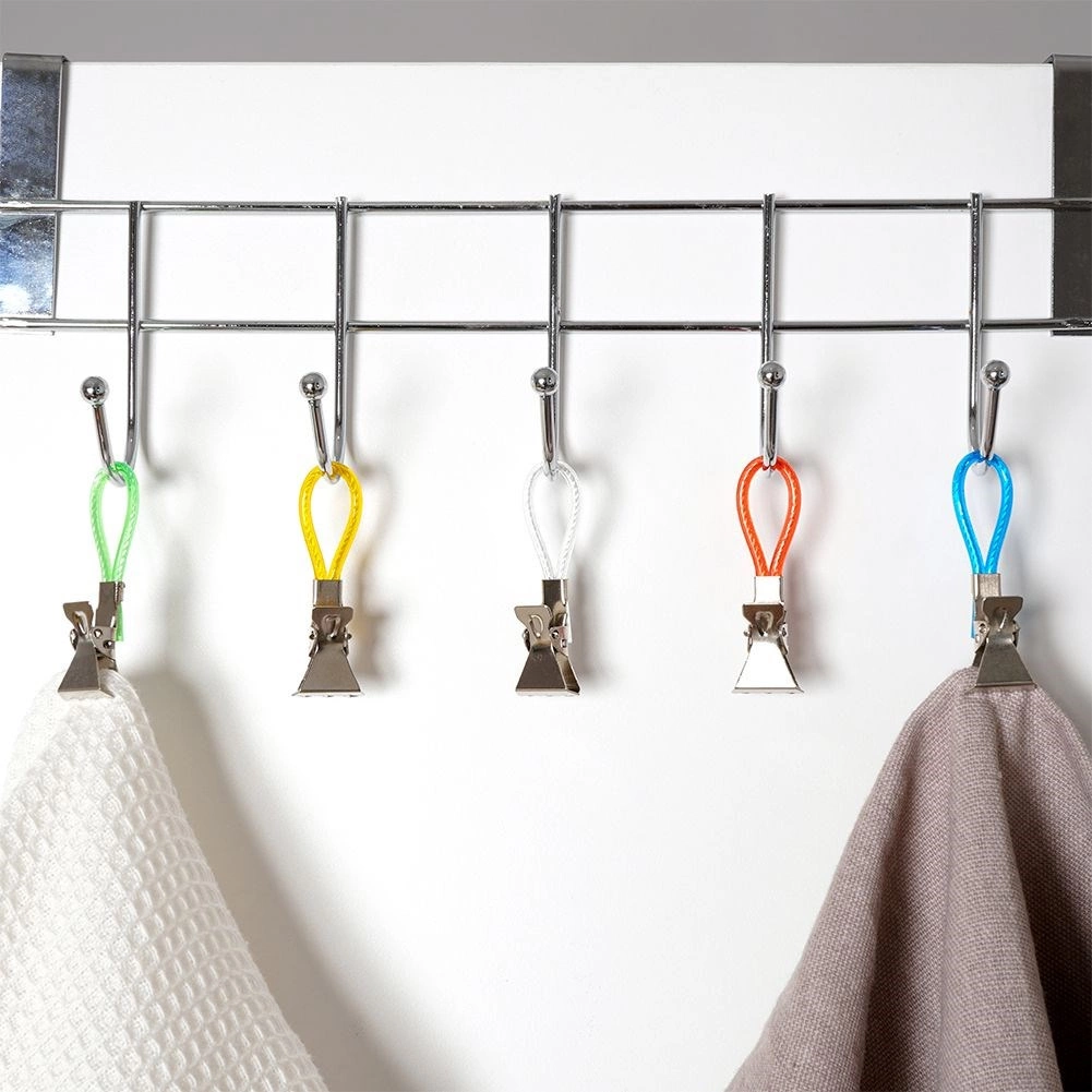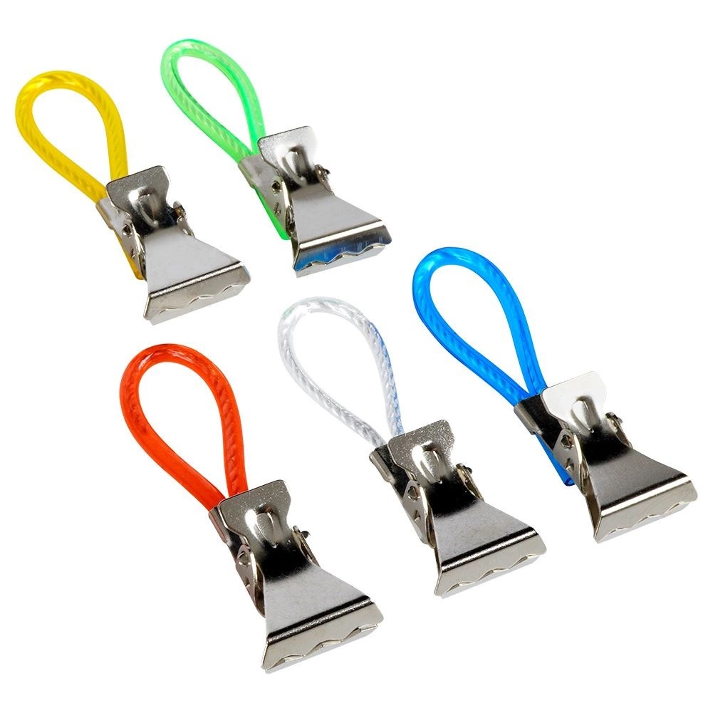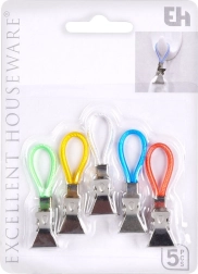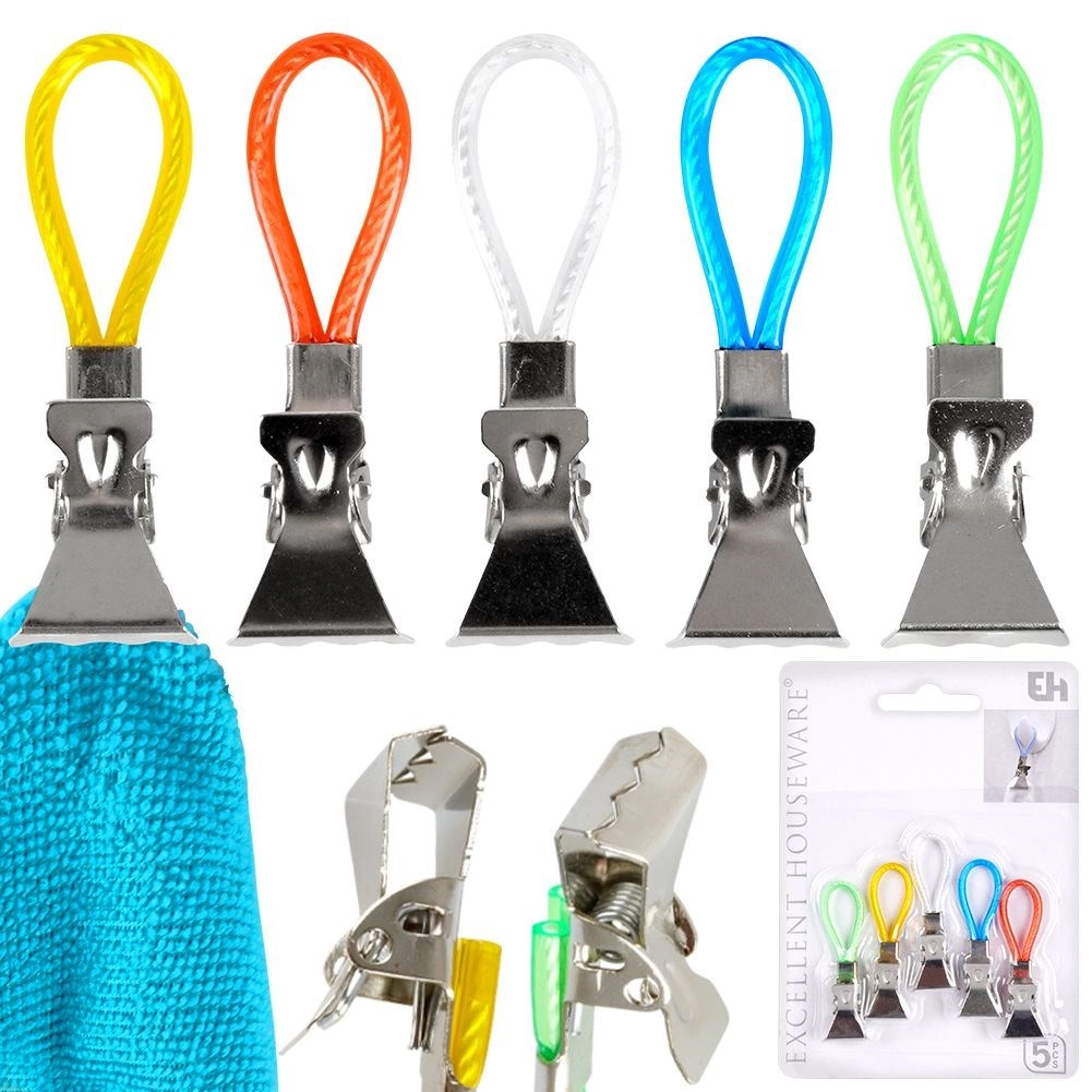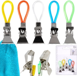 Pratique set de cinq pinces pour serviettes et torchons avec œillets colorés pour une suspension aisée. Les pinces ont des mâchoires métalliques robustes, une construction résistante et des boucles de couleurs variées pour une organisation claire. Idéales pour la salle de bain et la cuisine, elles tiennent fermement et ne glissent pas sur les textiles.