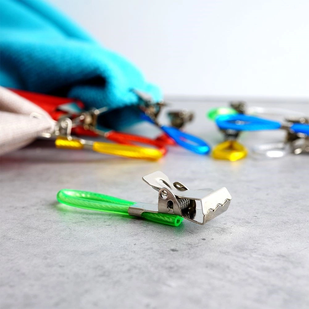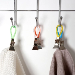 Découvrez une manière simple de garder serviettes et torchons toujours à portée de main et bien suspendus. Les pinces métalliques avec boucles colorées permettent une suspension rapide sur un crochet, une barre ou un porte-serviettes et, grâce aux mâchoires dentelées, tiennent fermement même sur les tissus plus lisses. Les différentes couleurs des boucles facilitent l’attribution des serviettes à chaque membre du foyer.