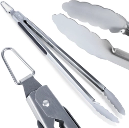 Ces pinces de grillade en acier inoxydable de qualité permettent de retourner confortablement et en toute sécurité viandes, légumes et autres plats sur le gril comme en cuisine. La longue poignée protège de la chaleur, tandis que les éléments antidérapants assurent une tenue stable même avec les mains grasses.
