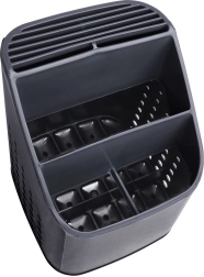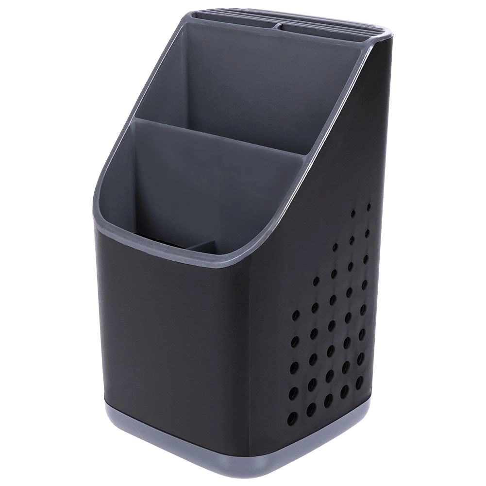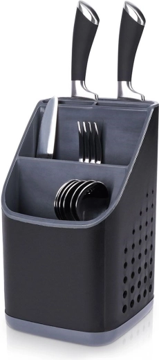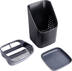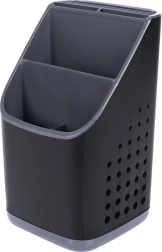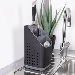 Le plastique de haute qualité de couleur noire avec détails graphite offre un look moderne qui s’intègre à la plupart des cuisines. En retirant l’organisateur interne, vous obtenez un récipient monocase spacieux, par exemple pour des ustensiles plus volumineux. Ses dimensions compactes lui permettent de se placer sur l’égouttoir de l’évier ou sur le plan de travail sans gêner.