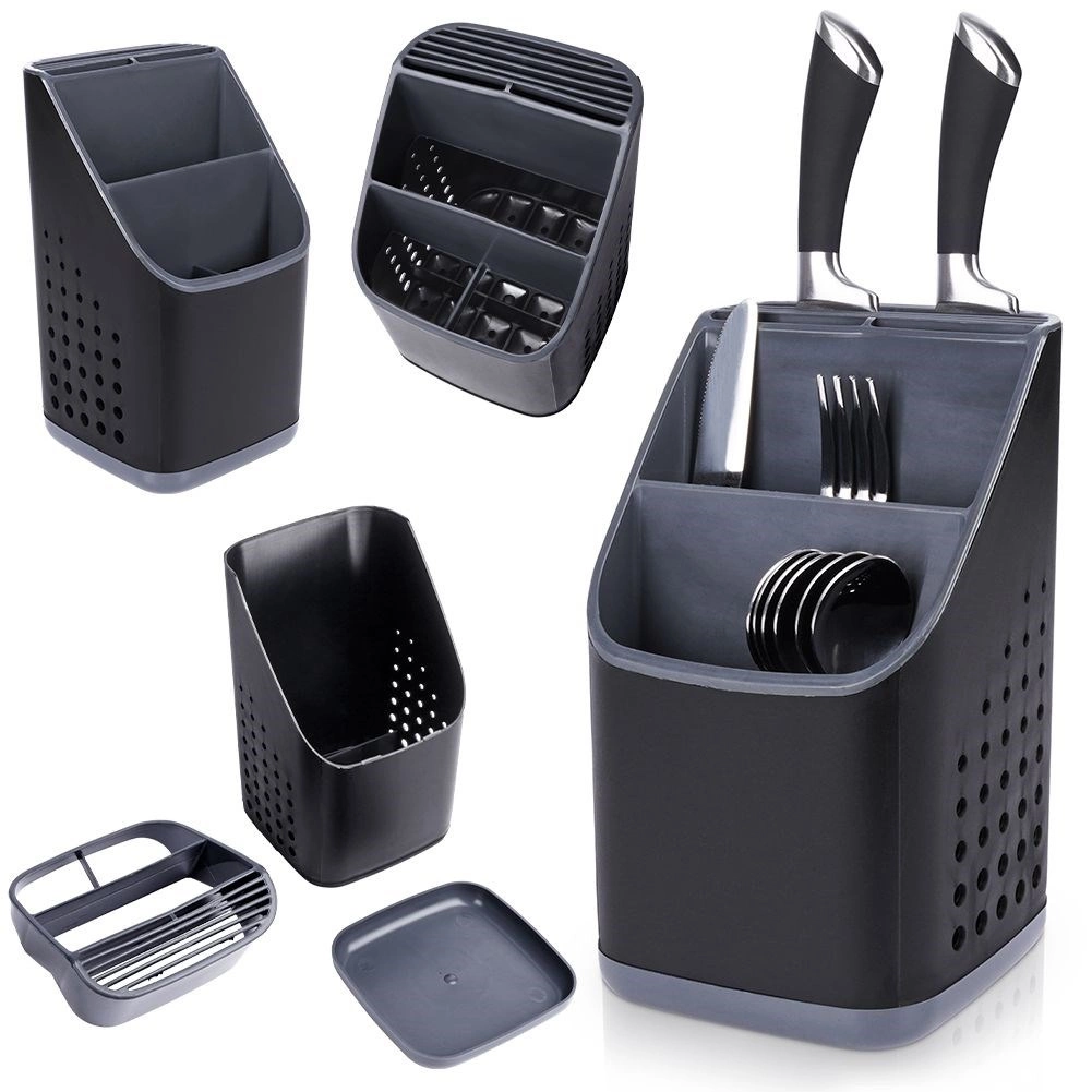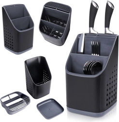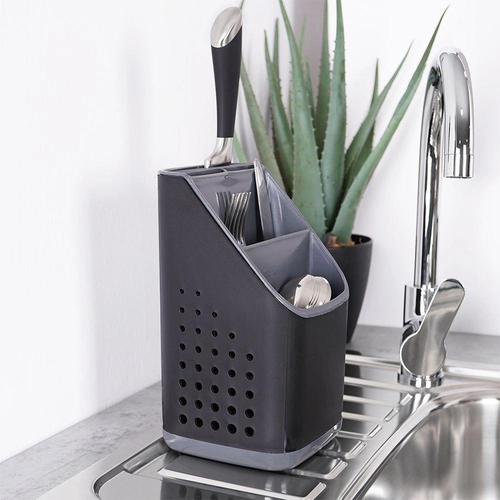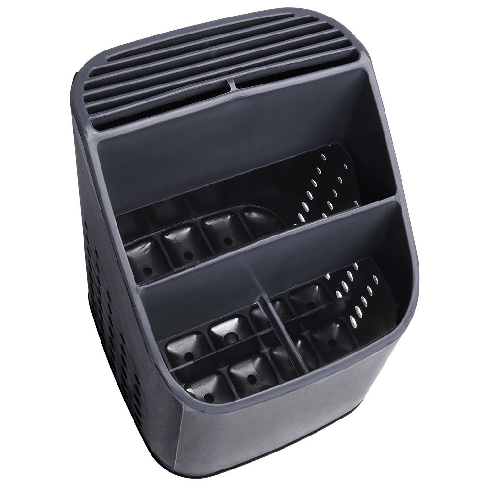 Égouttoir et organisateur pratique pour couverts et ustensiles de cuisine, dans une élégante couleur noire avec des éléments graphite. Grâce à sa conception bien pensée avec séparateur amovible, porte-couteaux supérieur et plateau d'égouttage, vos ustensiles de cuisine restent au sec et bien rangés. Léger, résistant et facile à nettoyer, un allié pour chaque cuisine.
