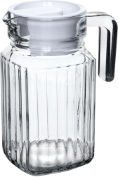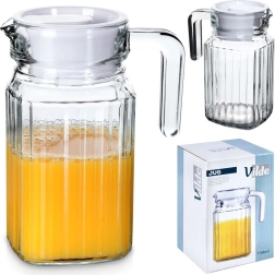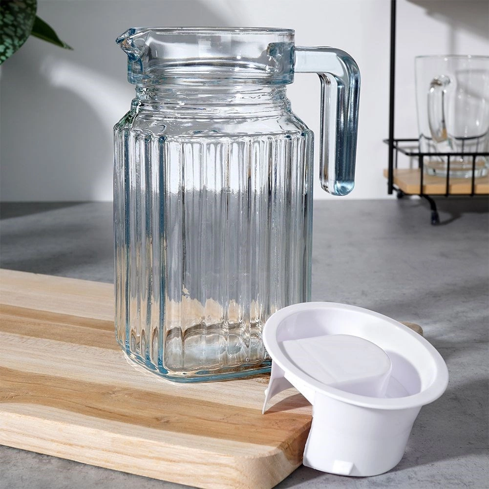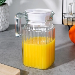 Ce pichet en verre allie design intemporel et praticité pour un usage quotidien. Le verre transparent et résistant avec un rainurage vertical assure une prise en main sûre et une apparence attrayante. Le couvercle blanc pratique protège les boissons et maintient la propreté lors du service à la maison comme en plein air.