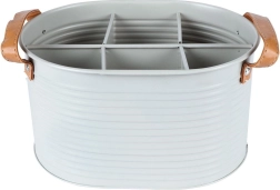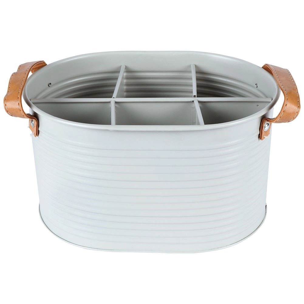 Organiseur élégant et résistant pour le transport des boissons, alliant fonctionnalité et design stylé. Le métal gris clair à surface gaufrée résiste à l’usage quotidien, tandis que les poignées en cuir marron offrent une prise confortable et un transport aisé.