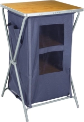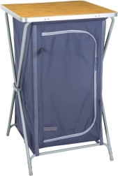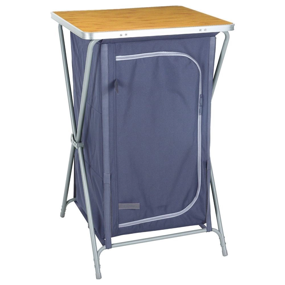 Avec cette armoire de camping pliante, bénéficiez d’un rangement clair et hygiénique en déplacement. Le cadre en acier résistant, le polyester de qualité en gris foncé et le plateau supérieur en MDF aspect bois forment une combinaison solide et mobile, facile à plier et à déployer.