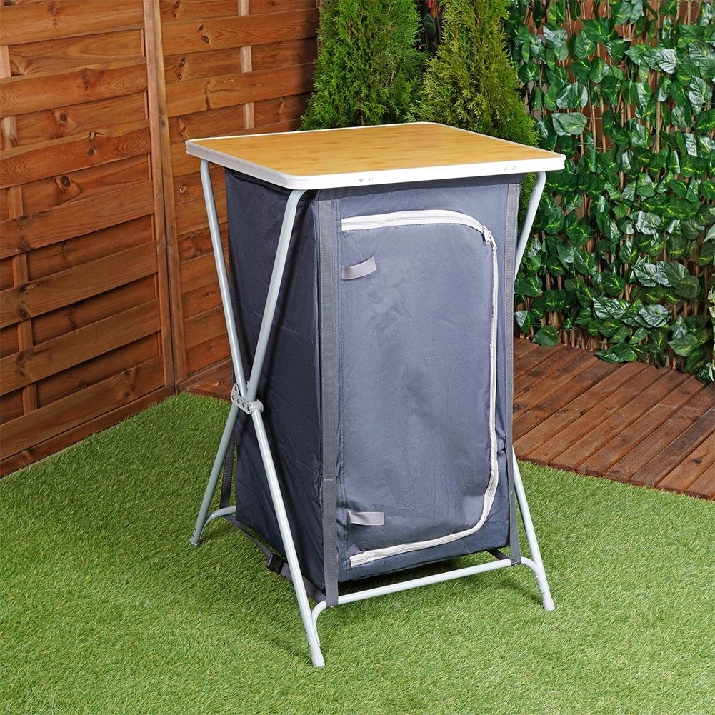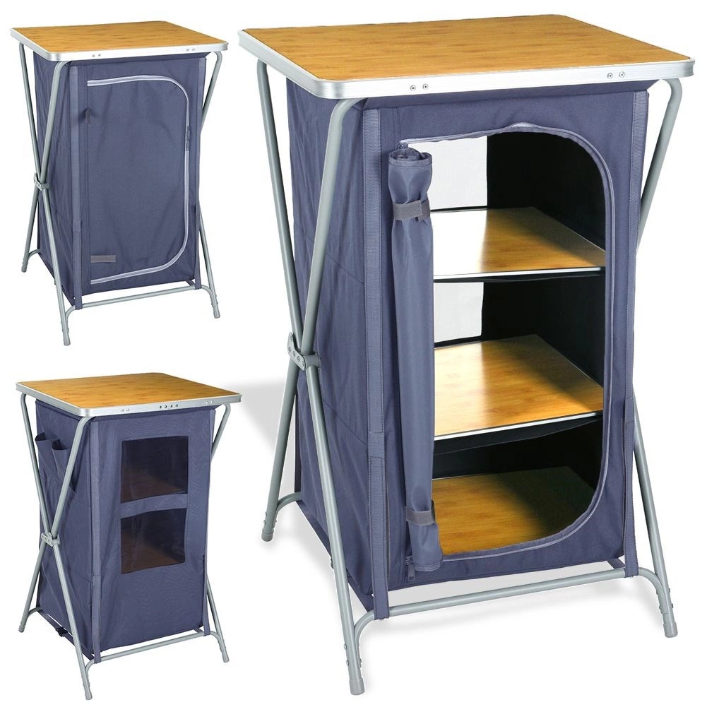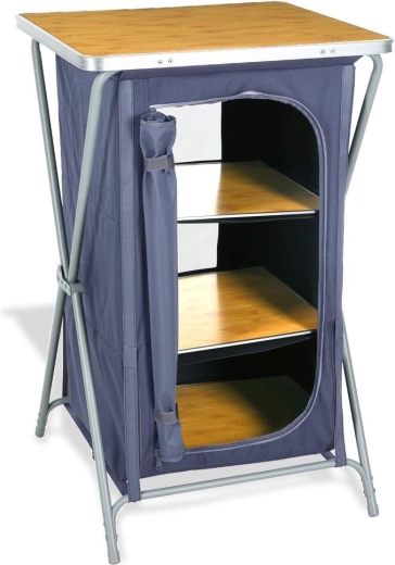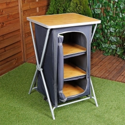 Armoire de camping pratique avec cadre en acier stable, tissu résistant et plateau en MDF aspect bois. Elle offre trois étagères spacieuses, un pliage rapide, une fermeture à glissière et un transport léger avec sac inclus. Idéale pour le camping, le caravaning et la tente.
