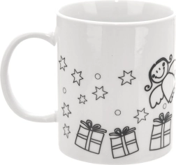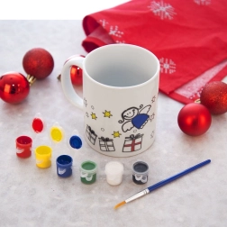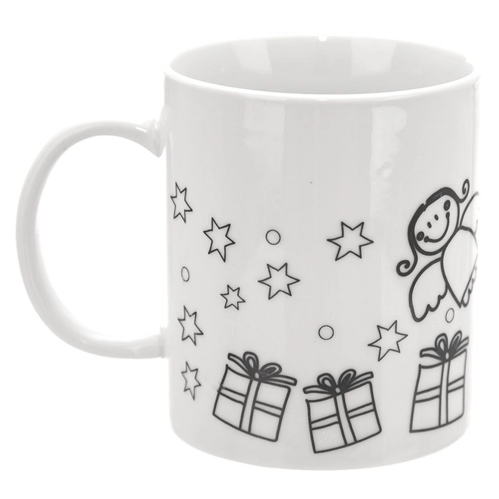 Créez votre propre mug de Noël ! Ce mug en porcelaine à colorier d’une capacité de 350 ml présente des contours préimprimés de sapin, cadeaux, étoiles et petit ange et le coffret inclut un pinceau et 6 peintures acryliques. Le mug est compatible lave-vaisselle et micro-ondes et, après cuisson au four, conserve longtemps des couleurs éclatantes.