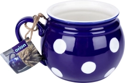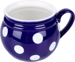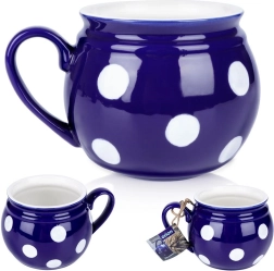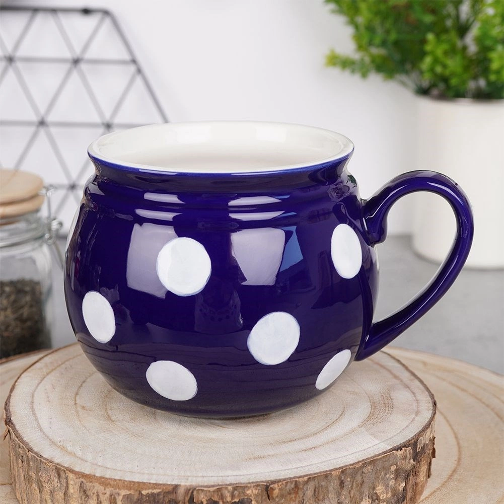 Grand mug en céramique avec anse d’une capacité de 850 ml, en élégante couleur bleu foncé avec des pois blancs. Il possède une anse confortable, une forme « tonneau » et convient pour le thé, le café, le cacao et le vin chaud. Il peut être lavé au lave-vaisselle et utilisé au micro-ondes, idéal pour un usage quotidien.