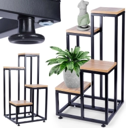 Élégant support de fleurs en métal avec quatre étagères d'une hauteur de 69 cm, idéal pour exposer des plantes et des décorations. La combinaison du métal et du MDF à l'effet bois garantit une résistance, une stabilité et un style industriel élégant. Grâce à ses dimensions compactes, il convient au salon, au bureau, ainsi qu'au balcon ou à la terrasse. Capacité de charge maximale jusqu'à 50 kg.