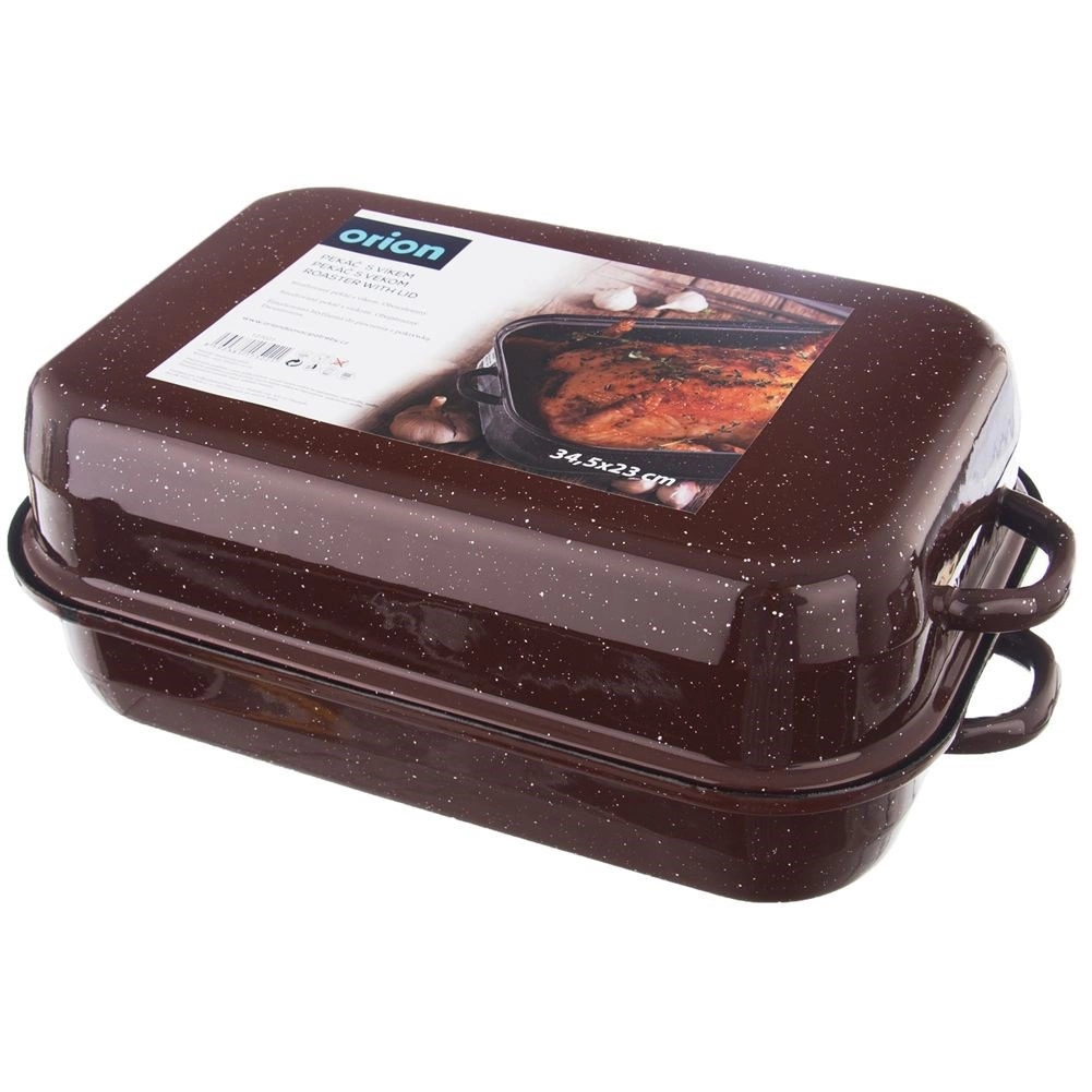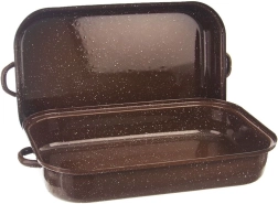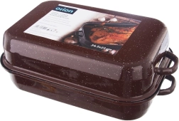 Rôtissoire rectangulaire en acier de qualité avec revêtement émaillé de couleur marron, offrant d’excellentes propriétés thermiques et une longue durée de vie. L’émail est inoffensif pour la santé et sûr même pour les personnes allergiques. Le couvercle avec poignées peut être utilisé séparément – vous obtenez ainsi deux plats pratiques pour la cuisson et le service.