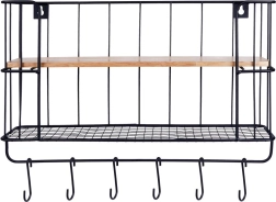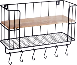 • Organisation fonctionnelle : tablette supérieure en bois, étagère inférieure en fil métallique et rangée de crochets.