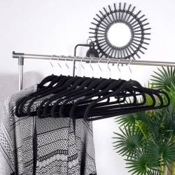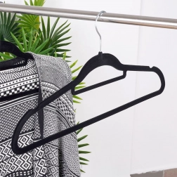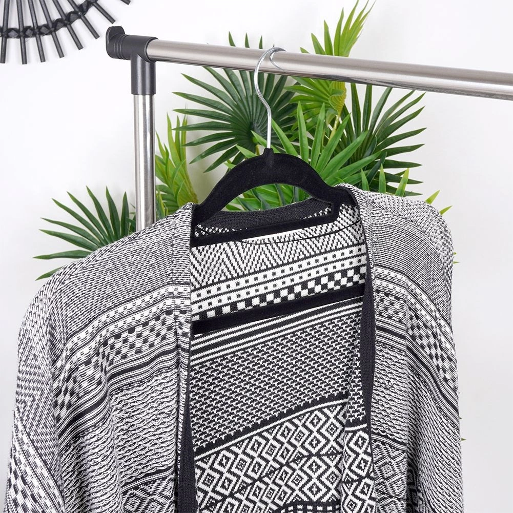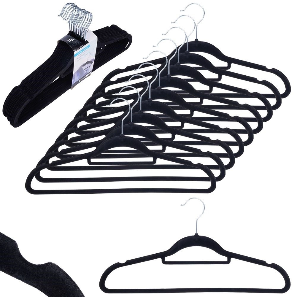 Des cintres noirs élégants avec surface en velours assurent un rangement antidérapant des vêtements et une économie d’espace efficace dans l’armoire. Grâce au crochet pivotant et aux encoches universelles, ils sont idéals pour les chemises, robes, jupes et pantalons. Le velours doux protège les tissus contre les plis et frottements et apporte à votre dressing une touche d’élégance.