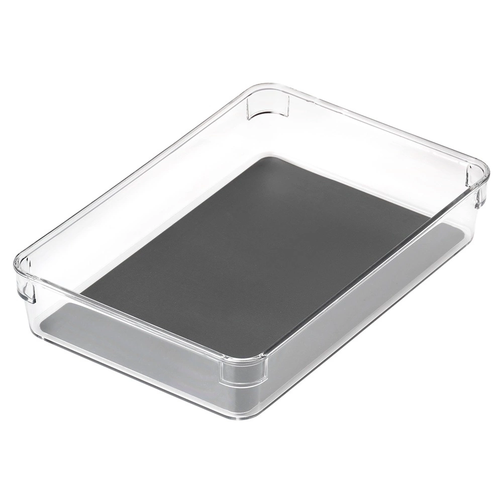 Le bac de rangement GREY est un organisateur résistant et transparent avec un tapis TPE amovible qui empêche les objets de glisser et facilite le nettoyage. Les pieds antidérapants garantissent la stabilité dans le tiroir comme sur une étagère, évitant tout déplacement lors de l’ouverture du tiroir.