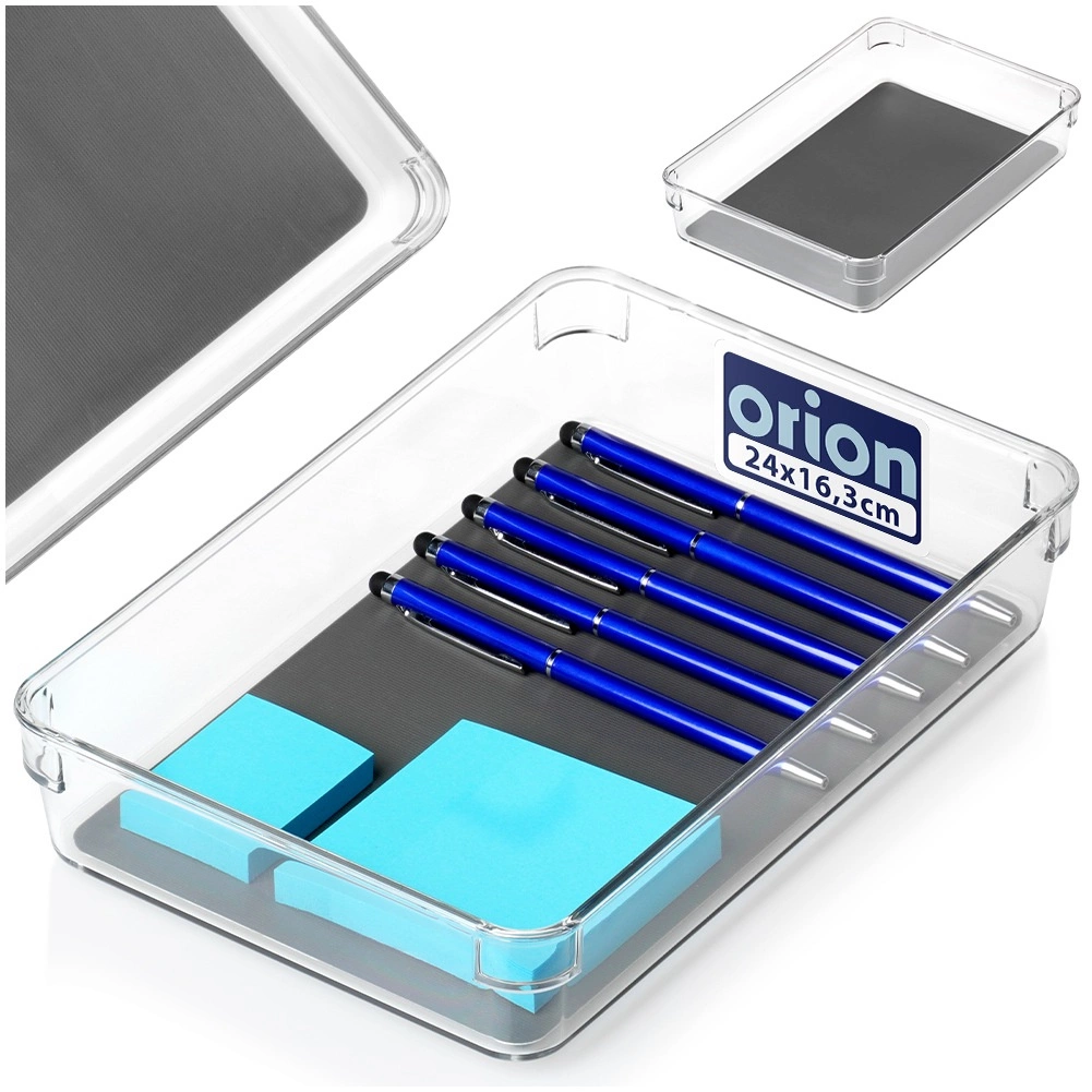 Organisateur pratique et universel pour tiroir ou armoire, pour un rangement clair des accessoires de cuisine, de bureau et de cosmétique. Il possède des parois transparentes pour une orientation facile, un tapis en caoutchouc gris amovible à l’intérieur et des pieds antidérapants en dessous qui maintiennent le plateau fermement en place. Grâce à ses dimensions de 24 × 16 × 4,5 cm, il s’adapte à la plupart des tiroirs et aide à garder l’ordre sans que les objets ne glissent.
