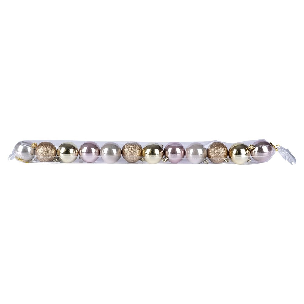 Un élégant lot de 12 boules de Noël dans des tons rose et or apporte une brillance unique à votre décoration. D’un diamètre de 5 cm, elles sont en plastique de qualité, donc incassables, sûres pour les enfants et les animaux de compagnie, tout en imitant l’apparence du verre. La combinaison de finitions brillantes et pailletées crée un effet harmonieux et festif.