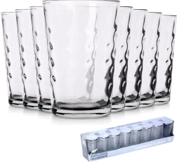 Élégant lot de huit verres de 200 ml avec relief décoratif pour une meilleure prise en main. Idéal pour l’eau, la limonade, les jus et les cocktails. Fabriqué en verre épais de haute qualité, utilisation polyvalente à la maison comme en restauration et nettoyage facile au lave-vaisselle.