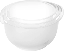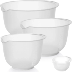 Ce set de bols de cuisine en plastique semi-transparent de qualité couvre la plupart des tâches en cuisine – du mélange de pâtes et du fouettage de crèmes à la préparation de salades. Les bols s'emboîtent facilement pour économiser de la place dans l'armoire, et grâce à la graduation sur la paroi, vous mesurez avec précision les ingrédients liquides comme les ingrédients secs.