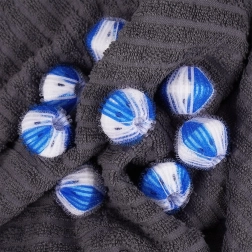 Pratique lot de 8 balles de lavage de 3,5 cm de diamètre qui aident pendant le lavage à capturer les poils, fibres et peluches, protègent le linge et la machine et améliorent l’efficacité du détergent. Balles résistantes en blanc et bleu avec une structure délicatement maillée douce pour les tissus, réutilisables jusqu’à 60 °C.