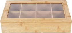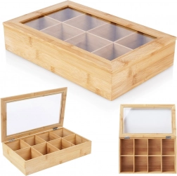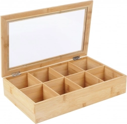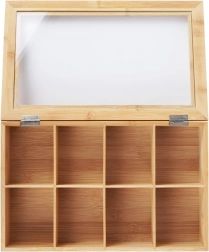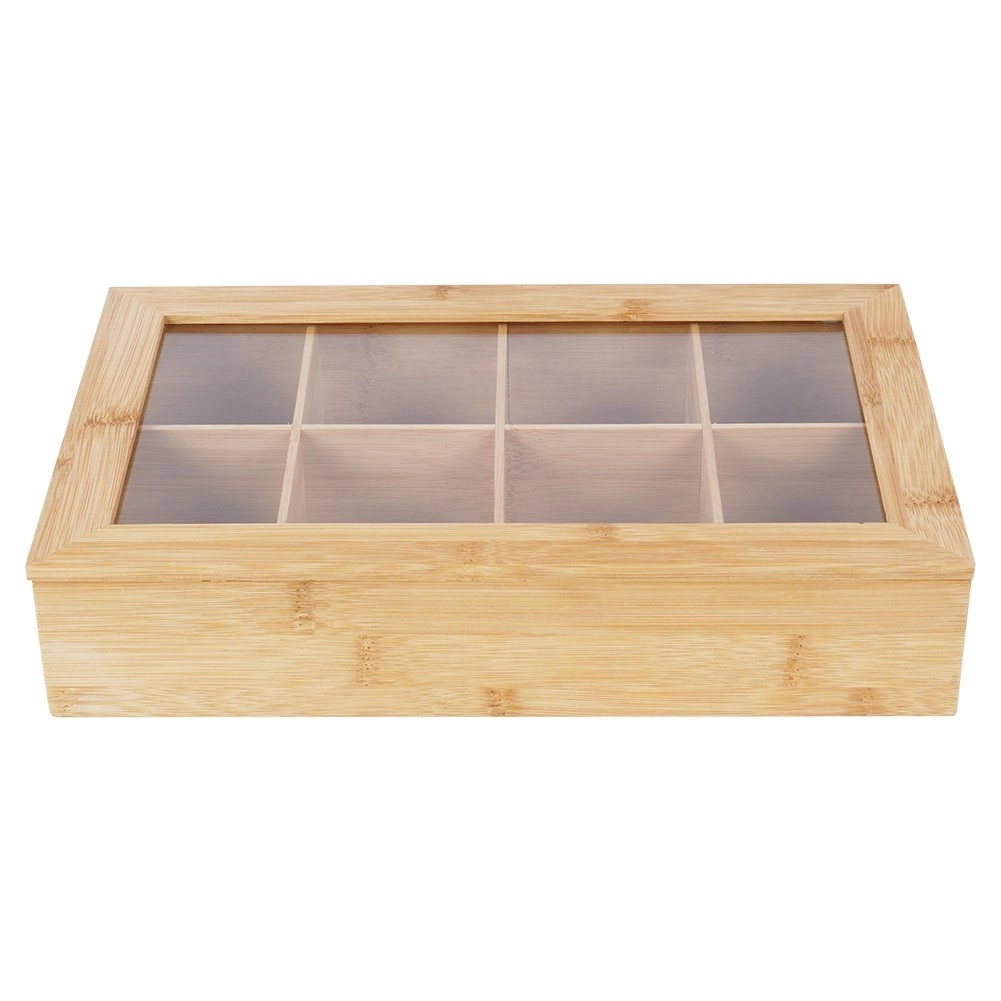 Élégante boîte à thé en bambou avec 8 compartiments et couvercle transparent pour garder vos thés préférés parfaitement organisés et plus longtemps frais et parfumés. Le bambou naturel est résistant à l’humidité, ne se déforme pas et n’absorbe pas les odeurs, idéal pour la cuisine comme pour les établissements de restauration.