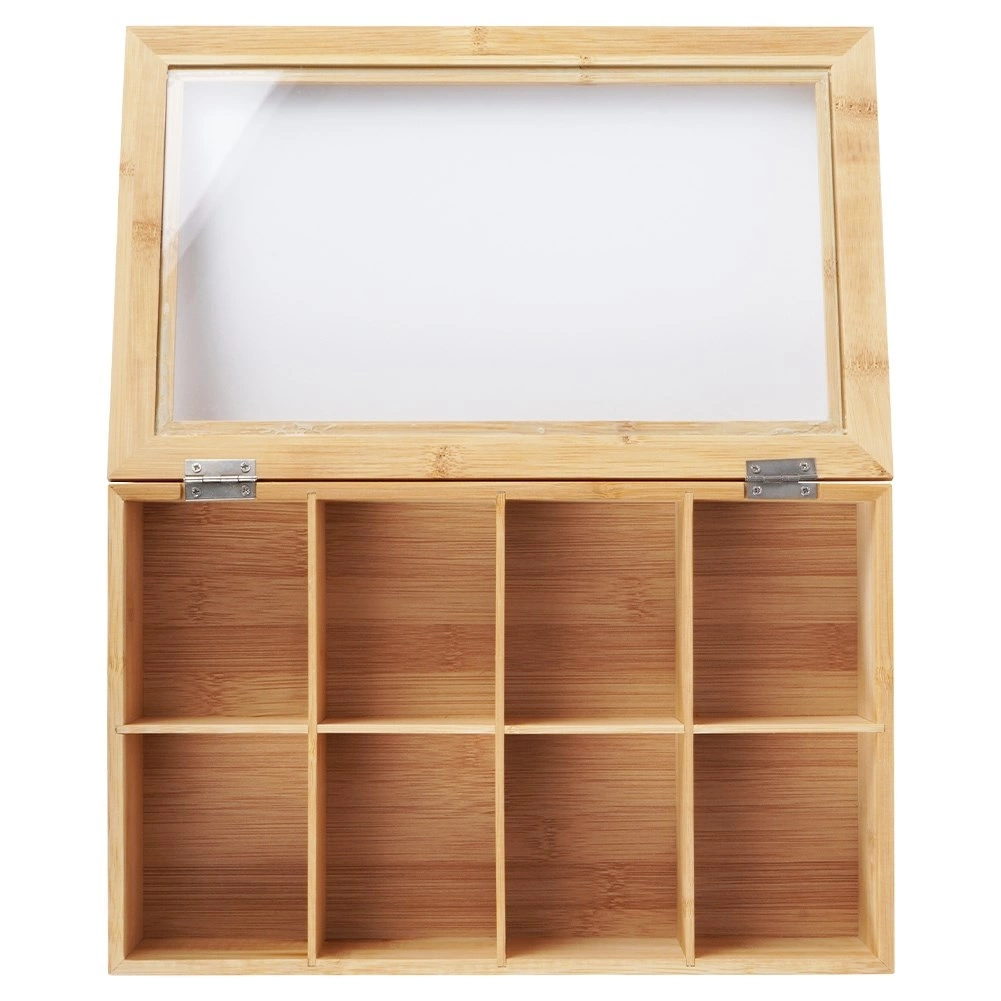 Cette boîte à thé en bambou au style soigné offre une solution à la fois pratique et esthétique pour ranger vos sachets de thé. Grâce à huit compartiments séparés, vous triez facilement les différents types et saveurs de thé. Le couvercle transparent permet un contrôle rapide du contenu sans avoir à ouvrir la boîte.