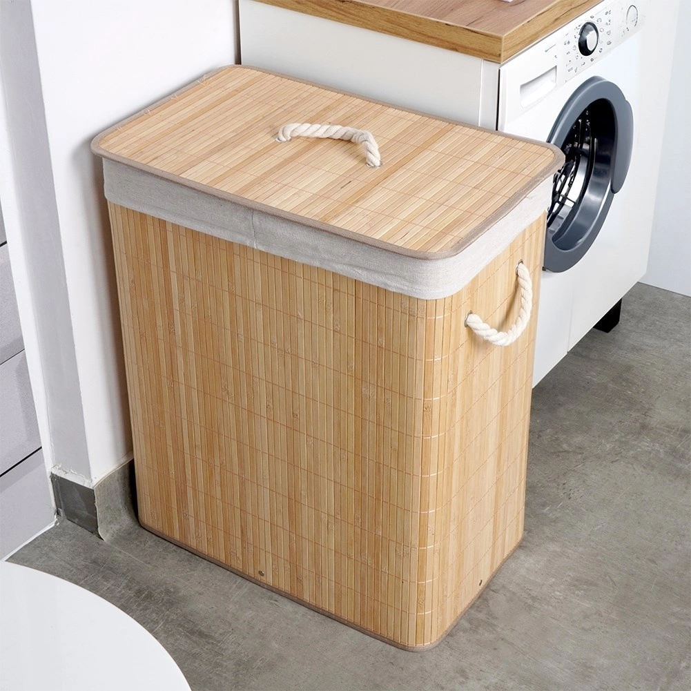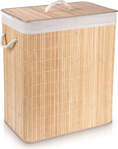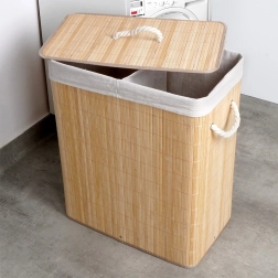 Panier à linge pratique et stylé d’une capacité de 90 l, en bambou naturel avec doublure à deux compartiments pour trier facilement le linge clair et foncé. Il dispose d’un couvercle amovible, d’une structure robuste et de poignées en corde pour un transport confortable. Son aspect naturel s’intègre parfaitement dans toute salle de bain ou buanderie.