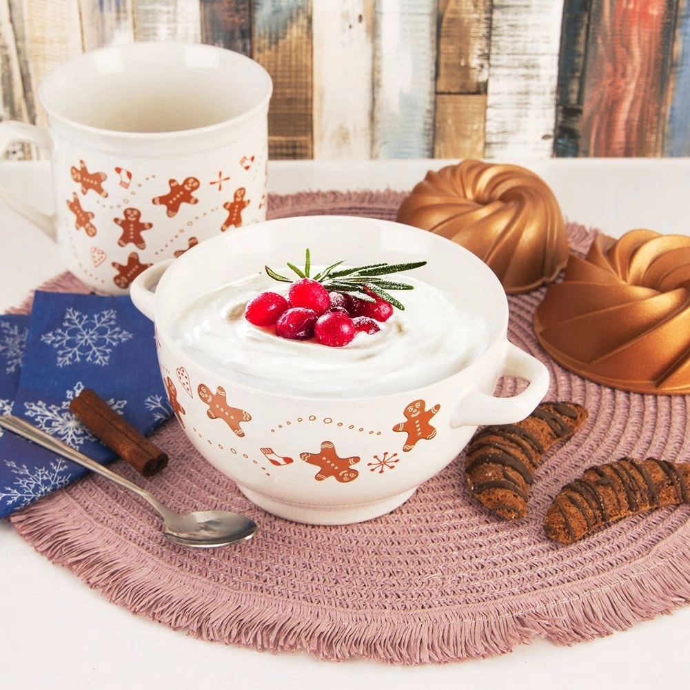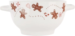 Bol à soupe élégant avec anses d’une capacité de 750 ml, en émail blanc avec motif de petits pains d’épices, idéal pour les soupes, crèmes et céréales. Grâce à ses deux anses pratiques, il se transporte aisément, passe au lave-vaisselle et au micro-ondes, et son design festif apporte de la chaleur à toute table.