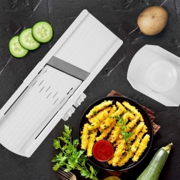 Mandoline et coupe-légumes universelle pour fruits et légumes avec réglage de l’épaisseur des tranches jusqu’à 8 mm, qui vous aide à préparer rapidement salades, chips et frites maison. Grâce aux lames en acier inoxydable affûtées, au porte-aliments de sécurité pratique et au réglage aisé, vous gagnez du temps et obtenez toujours des tranches régulières. Compatible lave-vaisselle pour un nettoyage facile.
