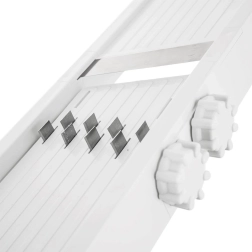 Cette mandoline robuste de couleur blanche allie vitesse, précision et sécurité pour la découpe des fruits et légumes. Le réglage d’épaisseur en continu via la molette latérale permet de trancher de l’extra fin jusqu’à des tranches plus épaisses, jusqu’à 8 mm – idéal pour les concombres de salade, les tranches pour le grill, des chips croustillantes et des frites maison.
