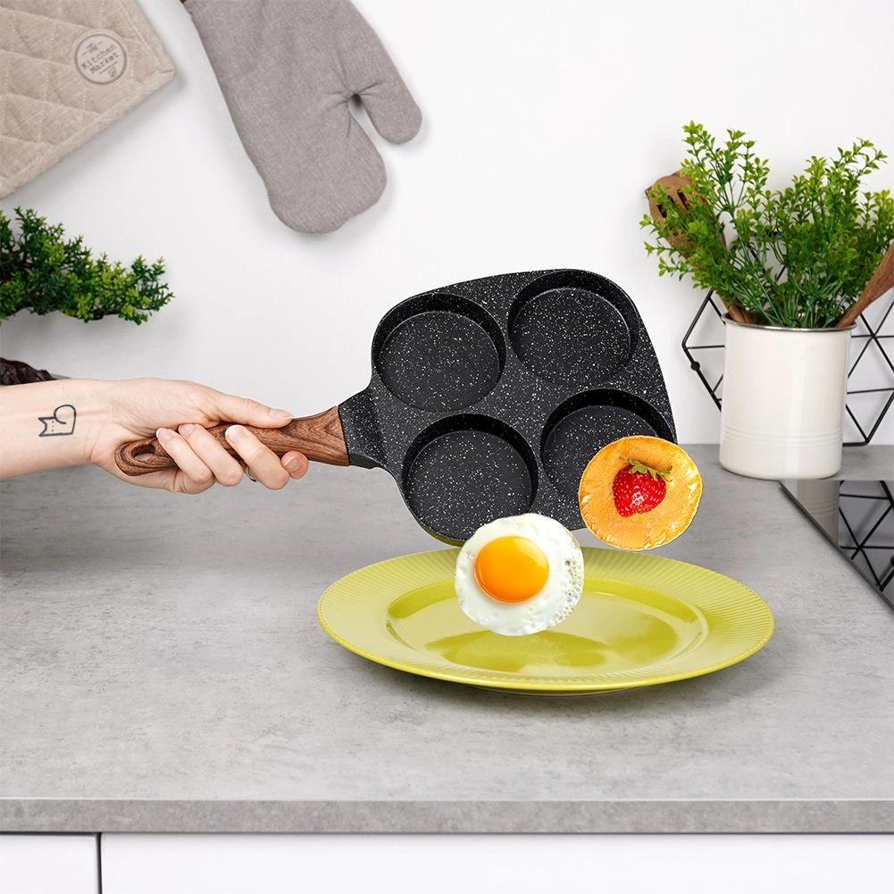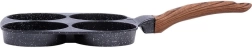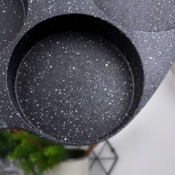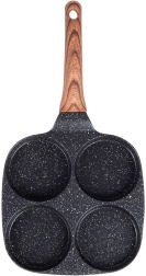 Poêle pratique avec quatre moules ronds de 8,5 cm de diamètre pour des œufs, blinis et mini crêpes parfaitement formés. Corps en aluminium résistant avec un revêtement granité antiadhésif de couleur noire permettant de cuisiner avec un minimum de matière grasse, assurant une diffusion uniforme de la chaleur et économisant temps et énergie. La poignée ergonomique au décor bois est confortable, antidérapante et dotée d’un trou pour la suspension. La poêle est compatible gaz, électricité, vitrocéramique, halogène et induction et est facile à nettoyer, y compris au lave-vaisselle.