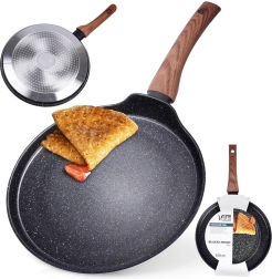 Poêle à crêpes en granit élégante de 26 cm de diamètre pour une cuisson uniforme des crêpes, pancakes et omelettes. Grâce au revêtement antiadhésif, vous cuisinez avec un minimum de matière grasse, rapidement et efficacement. La poignée ergonomique à imitation bois tient parfaitement en main et le bord bas facilite le versement de la pâte et le retournement.