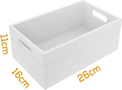 Cette caisse en bois blanche est un excellent choix pour un rangement stylé et ordonné à la maison comme au bureau. Grâce à ses dimensions compactes de 26 × 16 × 11 cm, elle trouve sa place sur une étagère, une commode ou un bureau, et ses poignées ovales permettent un transport confortable.