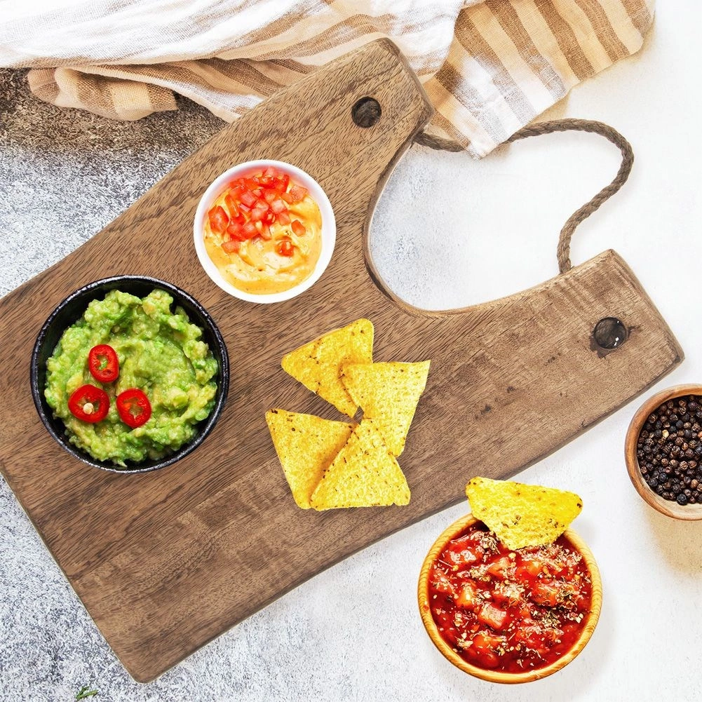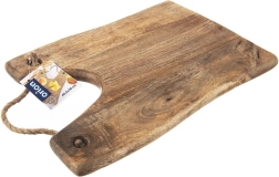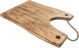 Pratique planche en bois de manguier pour la découpe et le service élégant. Elle offre une construction solide et durable, un aspect naturel et une suspension facile grâce à sa corde en jute.