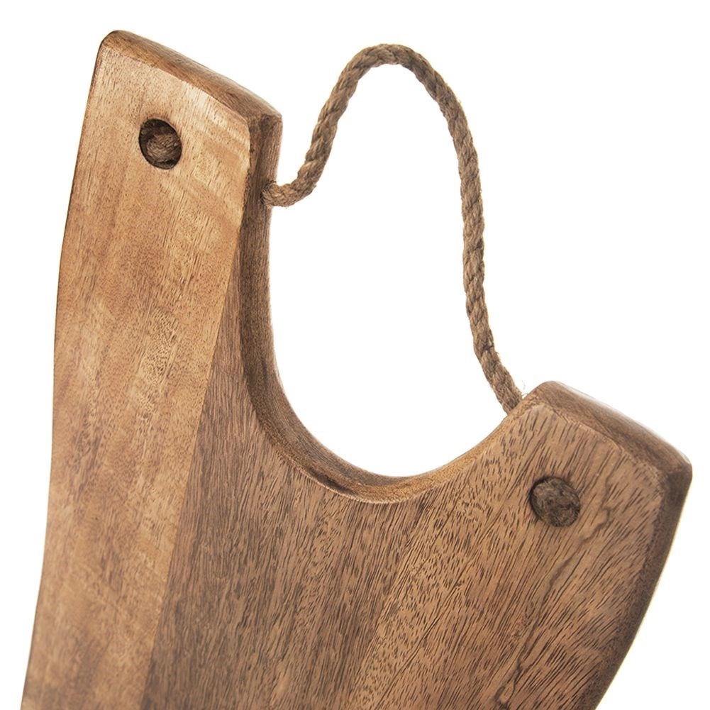 La planche présente une forme marquée et irrégulière avec un veinage du bois bien visible, ainsi qu’une lanière pratique en corde de jute pour un transport aisé et une suspension facile. Sa fabrication massive protège le plan de travail des rayures et garantit une longue durée de vie.