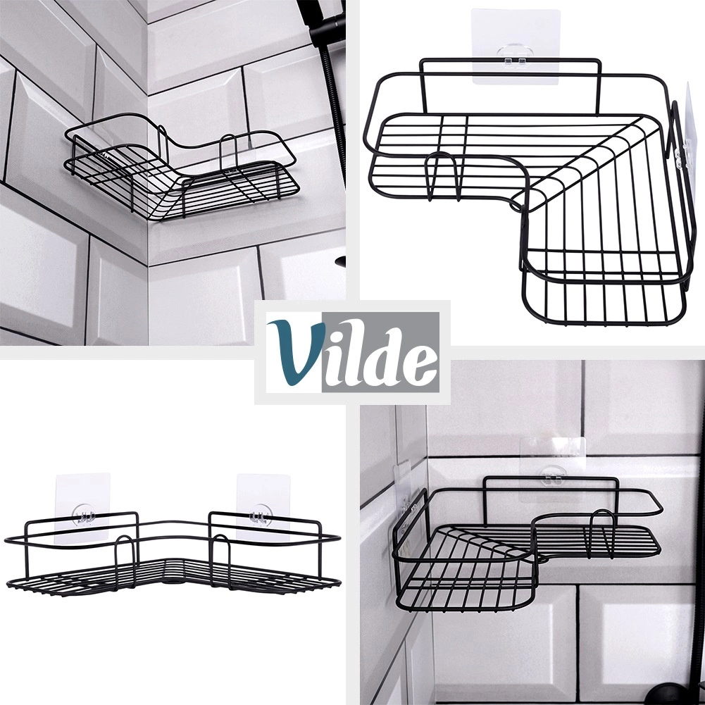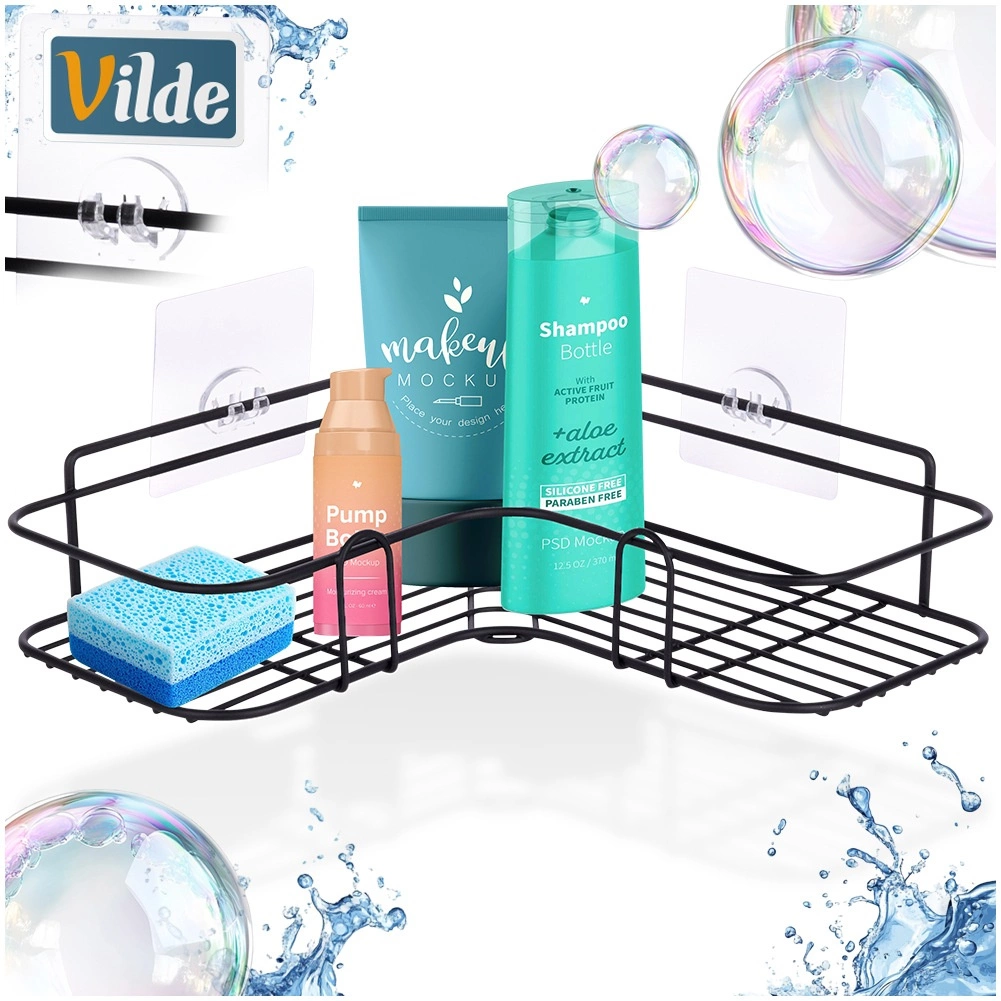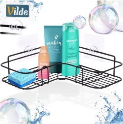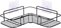 Pratique étagère d’angle pour salle de bain avec montage autocollant sans perçage, fabriquée en métal résistant thermolaqué noir mat. Idéale pour la douche, près de la baignoire ou du lavabo, avec des dimensions de 26,5 × 26,5 × 6,5 cm. Elle garde vos cosmétiques et accessoires de salle de bain à portée de main et, grâce à ses matériaux durables, est facile à entretenir et ne rouille pas.