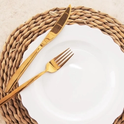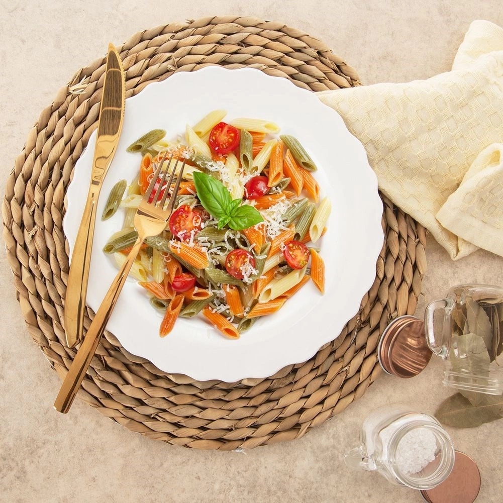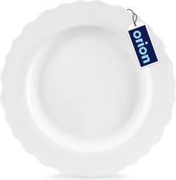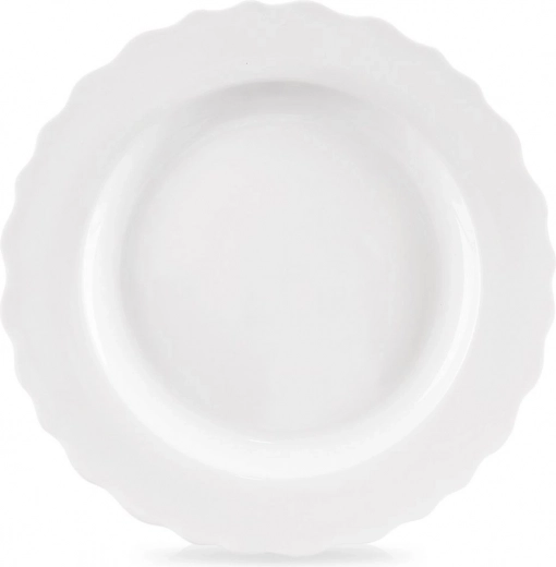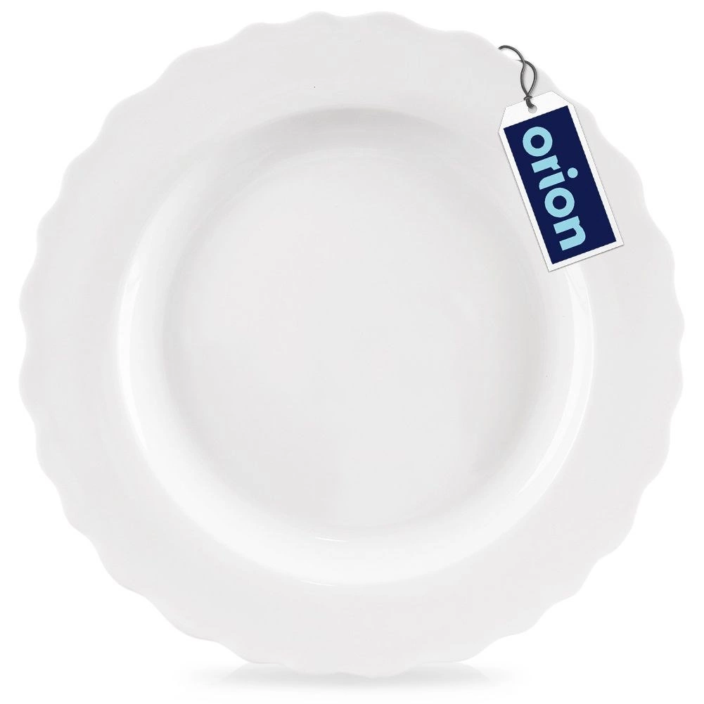 Élégante assiette plate en porcelaine de 24,5 cm de diamètre, parfaite pour le service quotidien comme pour les grandes occasions. Elle présente un design classique blanc, un bord ondulé décoratif, passe au lave-vaisselle et au four à micro-ondes, et grâce à sa glaçure en porcelaine de qualité, elle durera de longues années.