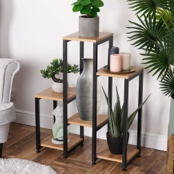 Un porte-plantes élégant au style industriel moderne offrant 6 étagères sur 5 niveaux de hauteur, idéal pour les plantes et les décorations. Sa structure métallique robuste noire et ses plateaux en MDF aspect bois assurent stabilité et longue durée de vie. Grâce à ses dimensions compactes 62 × 24 × 80 cm et à sa capacité de charge jusqu’à 60 kg, il convient au salon, à la cuisine, à l’entrée comme au bureau.