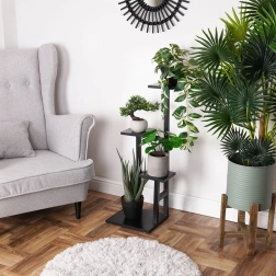 Élégant support à plantes à quatre étages avec base compacte qui économise de la place et expose clairement vos plantes et décorations. Il mesure 36,5 × 32 × 84 cm et supporte jusqu’à 15 kg (max. 5 kg par étagère). La combinaison de métal résistant et de MDF aspect bois en noir, sa structure stable et son style industriel conviennent au salon, au bureau comme au balcon.
