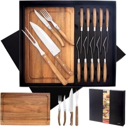 Ensemble complet pour les amateurs de viande et de barbecue : set de 15 pièces de couverts à steak avec couteaux fortement dentelés, planche en acacia robuste et ustensiles de service. Des manches en bois ergonomiques, de l’acier inoxydable de qualité et un coffret cadeau élégant en font un excellent choix pour la maison comme pour la restauration.