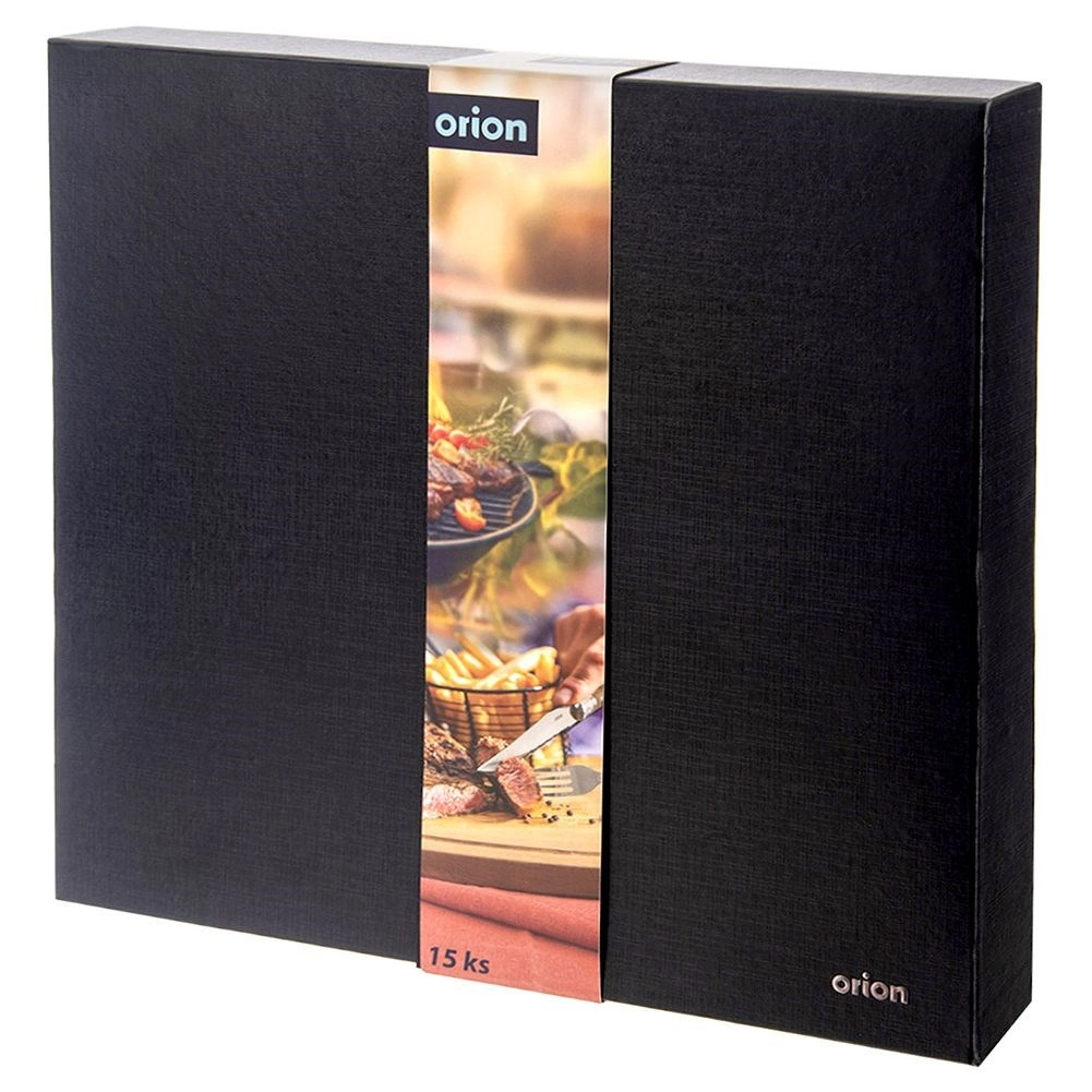 - Équipement complet pour 6 personnes – fourchettes et couteaux à steak + couteau de chef, fourche à viande et planche.