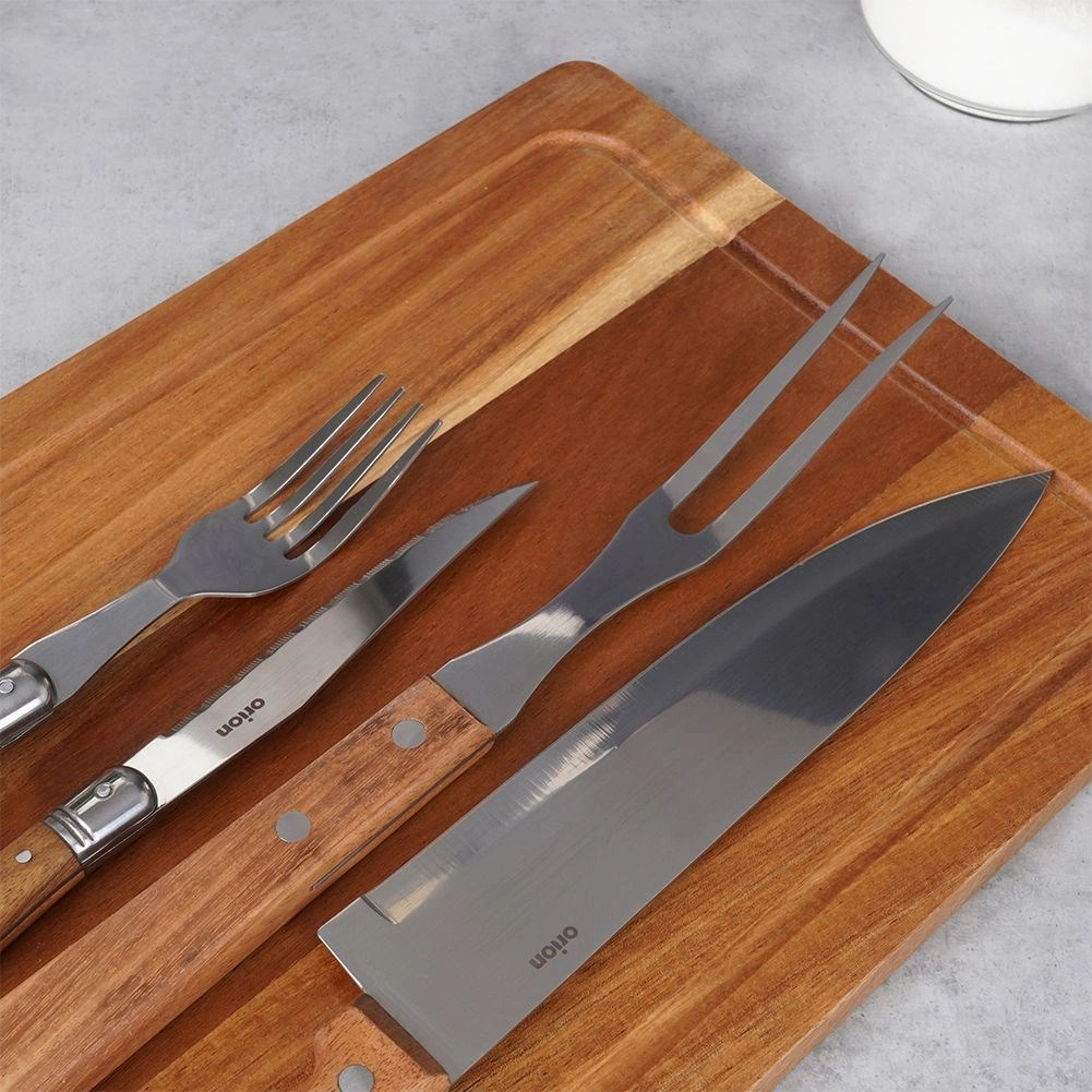 Ce set polyvalent allie découpe précise et service élégant. Les lames dentelées en acier inoxydable gèrent steaks, burgers et pizza, tandis que le couteau de chef et la fourche à viande facilitent la découpe. Les manches ergonomiques en acacia avec triple rivetage assurent une prise ferme et confortable.