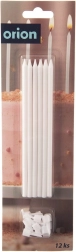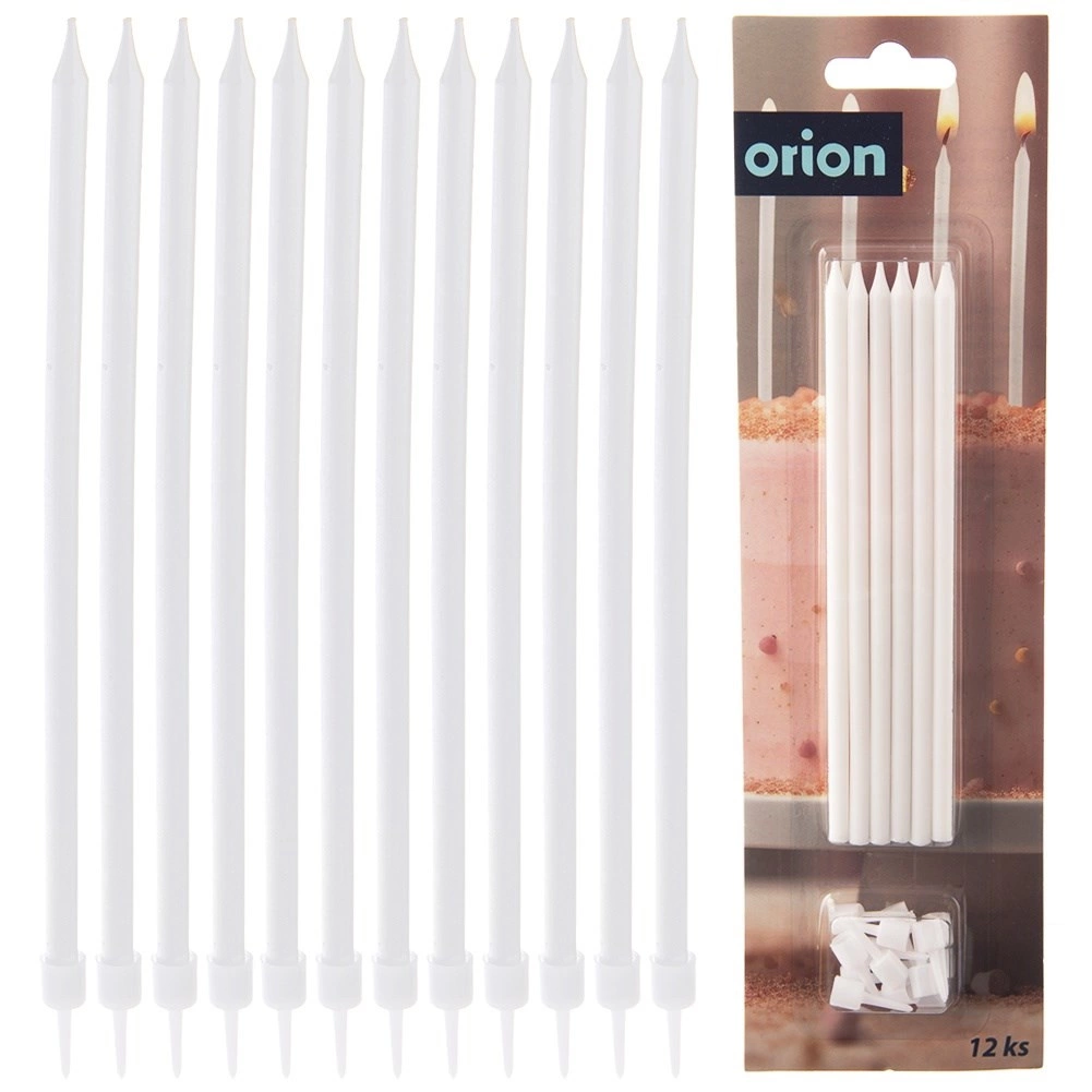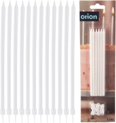 Set de 12 longues bougies pour gâteau de 14,5 cm de longueur, couleur blanche, avec supports en plastique. Elles sont stables, spectaculaires et universelles pour tout gâteau ou dessert – idéales pour les anniversaires, jubilés et autres fêtes.